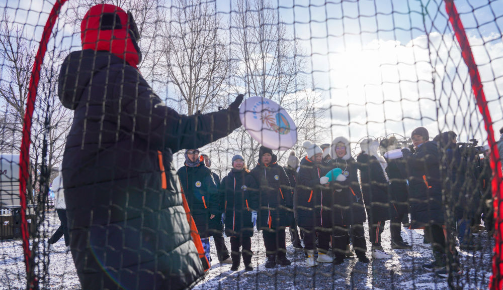 ↑12月3日,吉林市第一实验小学学生在吉林市纳美山谷度假区体验雪地飞盘。新华社记者 颜麟蕴 摄