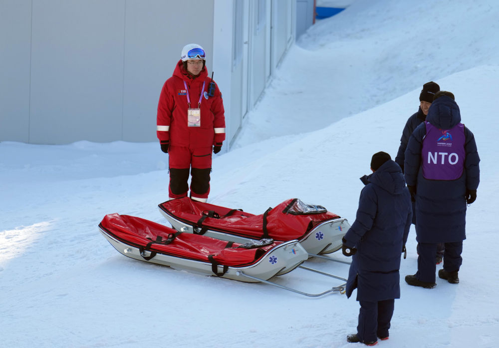 ↑2月11日,雪域救援专业人员(左)值守在第九届亚冬会自由式滑雪男子空中技巧双人同步赛场内。新华社记者 王松 摄
