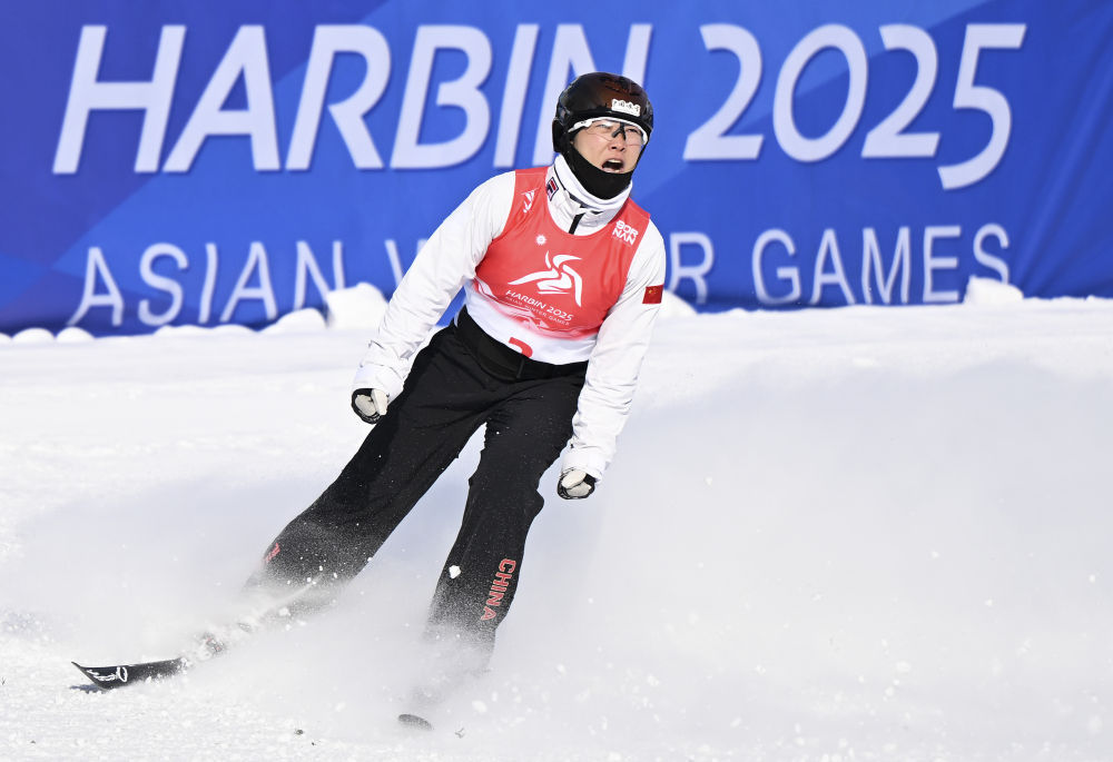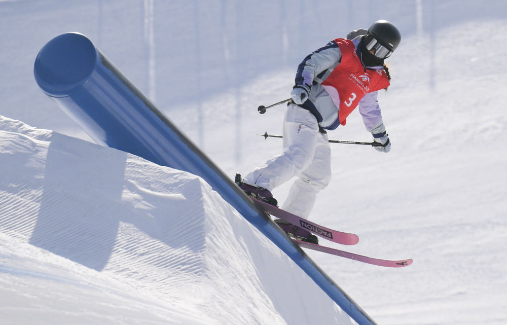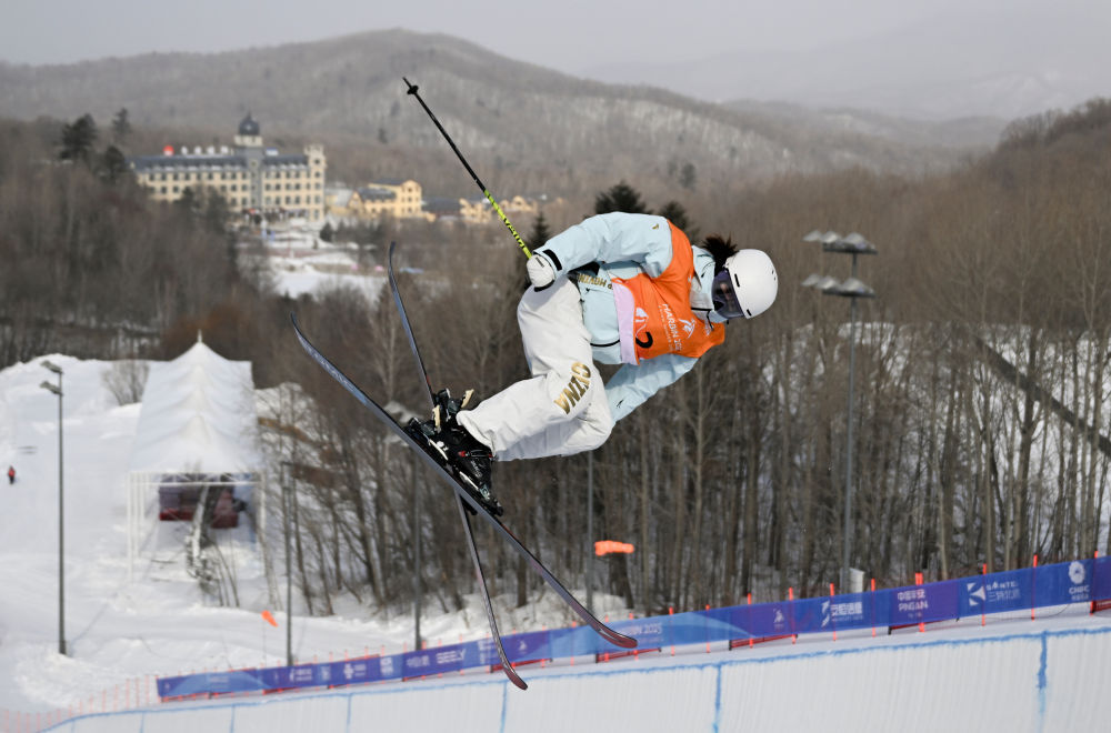 ↑2月11日,中国选手韩林杉在第九届亚冬会自由式滑雪女子坡面障碍技巧决赛中。最终,她获得季军。新华社记者 牟宇 摄