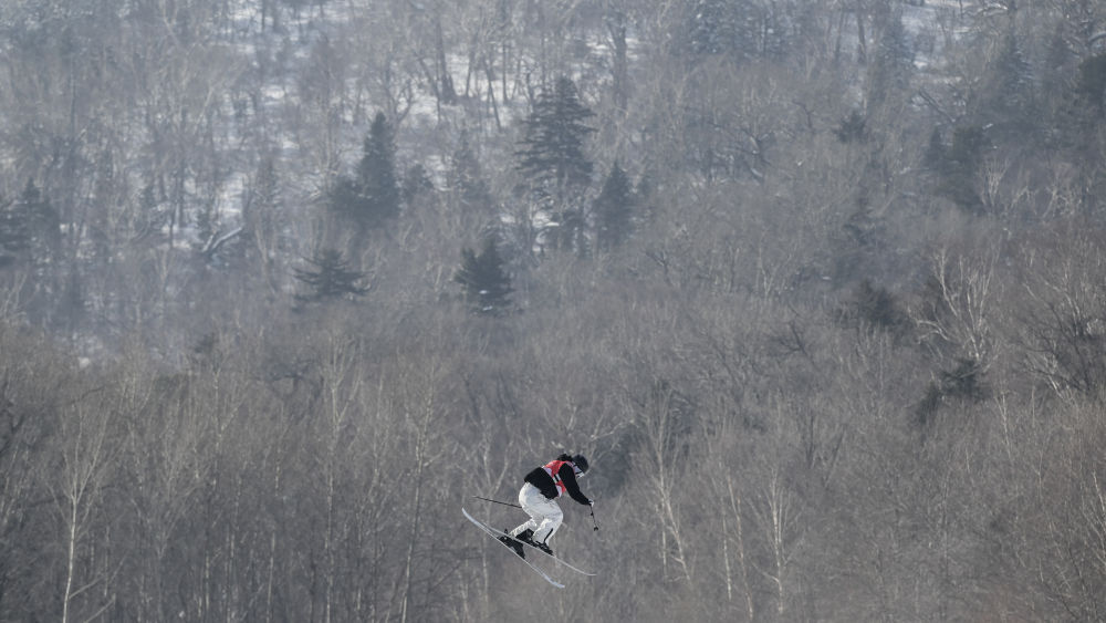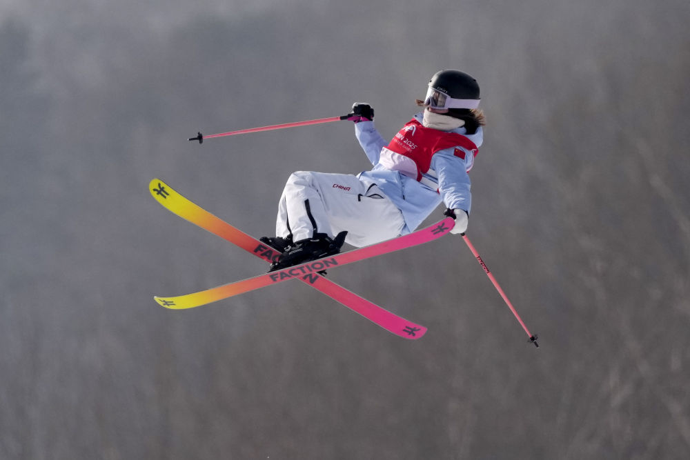 ↑2月12日,中国选手杨如意在第九届亚冬会自由式滑雪女子大跳台决赛中。最终,她获得季军。新华社记者 王松 摄