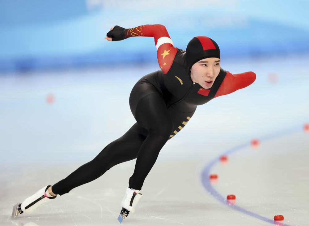 ↑2月11日,中国选手韩梅在第九届亚冬会速度滑冰女子1000米决赛中获得冠军。新华社发(兰红光摄)