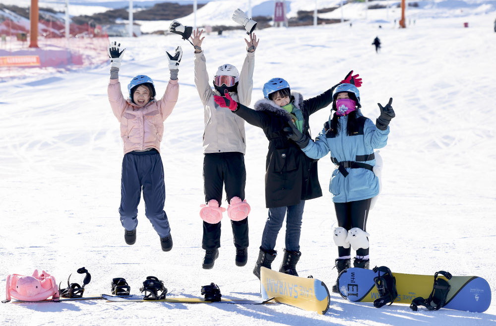 ↑这是2025年1月27日拍摄的几名滑雪爱好者在新疆丝绸之路山地度假区合影留念。新华社记者 王菲 摄