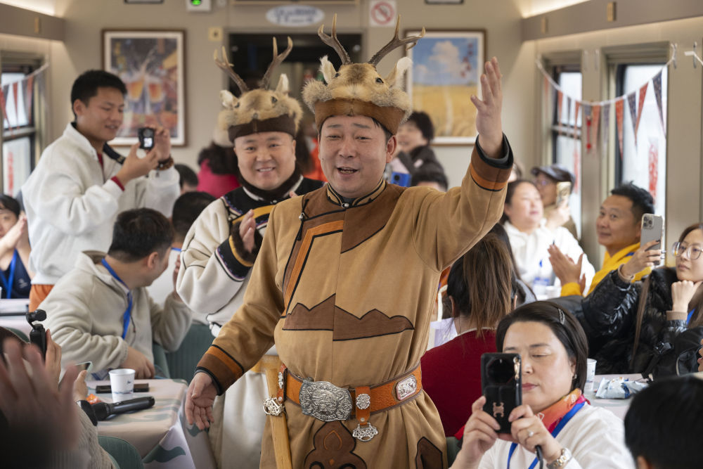 ↑11月26日,在Y783次“悠享龙江·银旅号”旅游列车上,鄂伦春族演员在表演。该趟列车是中国铁路哈尔滨局集团有限公司今冬开行的首趟高品质冰雪旅游列车。新华社记者 张涛 摄
