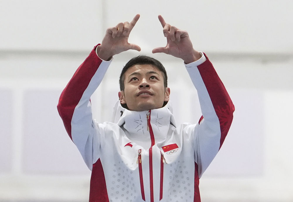 ↑2月11日,冠军中国选手宁忠岩在第九届亚冬会速度滑冰男子1000米颁奖仪式上。新华社记者 李一博 摄