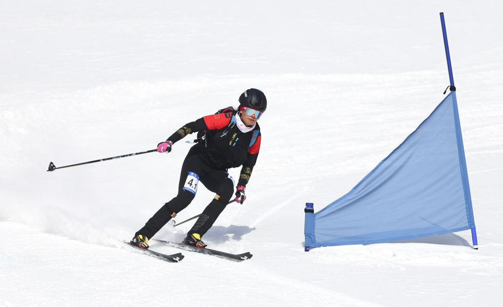 ↑2月12日,中国选手索朗曲珍在第九届亚冬会滑雪登山混合接力预赛中。新华社记者 杨青 摄