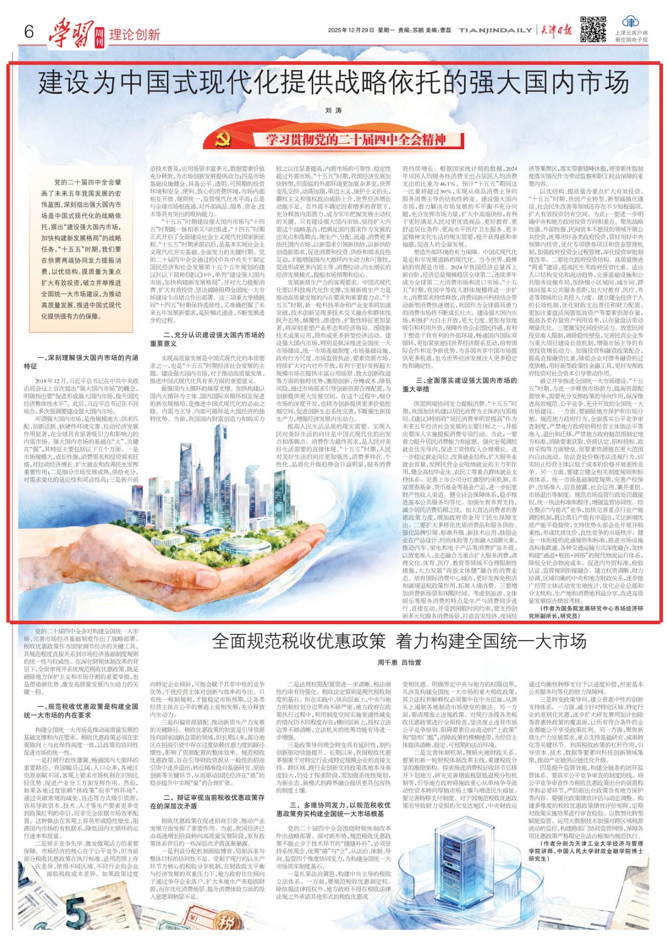 党的二十届四中全会擘画了未来五年我国发展的宏伟蓝图,深刻指出强大国内市场是中国式现代化的战略依托,提出“建设强大国内市场,加快构建新发展格局”的战略任务。“十五五”时期,我们要在供需两端协同发力提振消费,以优结构、提质量为重点扩大有效投资,破立并举推进全国统一大市场建设,为推动高质量发展、推进中国式现代化提供强有力的保障。