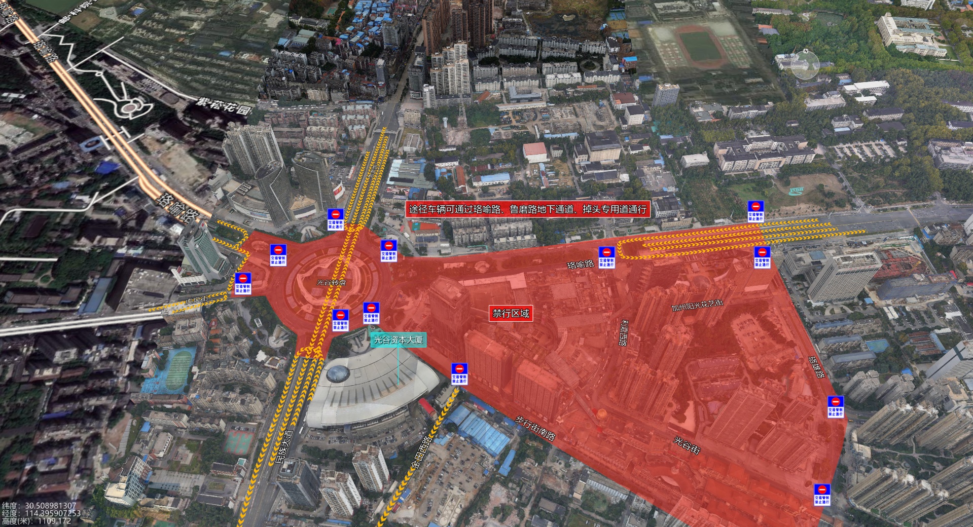 2.需通行光谷步行街区域的车辆,可绕行雄楚大道、关山大道、常青藤路。