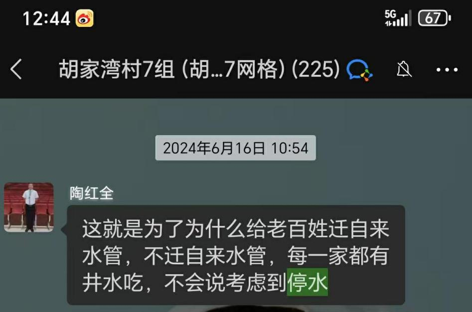 2024年6月,胡家湾村七组村民陶红全在村组群里“吐槽”停水