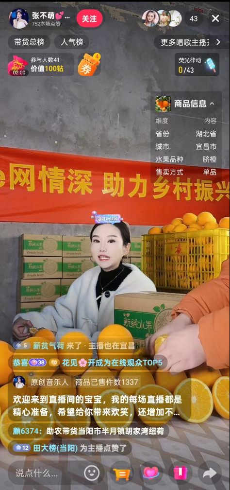 胡家湾村深知要想走好网上群众路线,既要解民忧,更要助民富。此前不少村民在当面向村干部反映:“种出来的柑橘卖不上好价钱,想通过直播带货却不懂怎么操作。”在村“两委”的积极号召下,位于胡家湾村的宜昌市半山农业科技有限公司的“90后”青年团队毛遂自荐,免费为村民们提供电商培训,让村民搭上电商快车。又通过镇政府相关部门对接当阳市自媒体协会,搭建助农直播带货平台,帮助村民们“解近渴”,单日销售万斤鲜橙。如今,村里越来越多的村民拿起手机当主播,自家种的柑橘不愁卖,还带动了周边村镇的农产品销售,实现“一人直播、全村增收”的良性循环,切实享受到数字经济带来的红利。