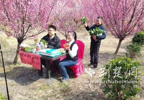 罗店镇工作人员在花海中开展助农直播,推介特色农产品。通讯员 供图