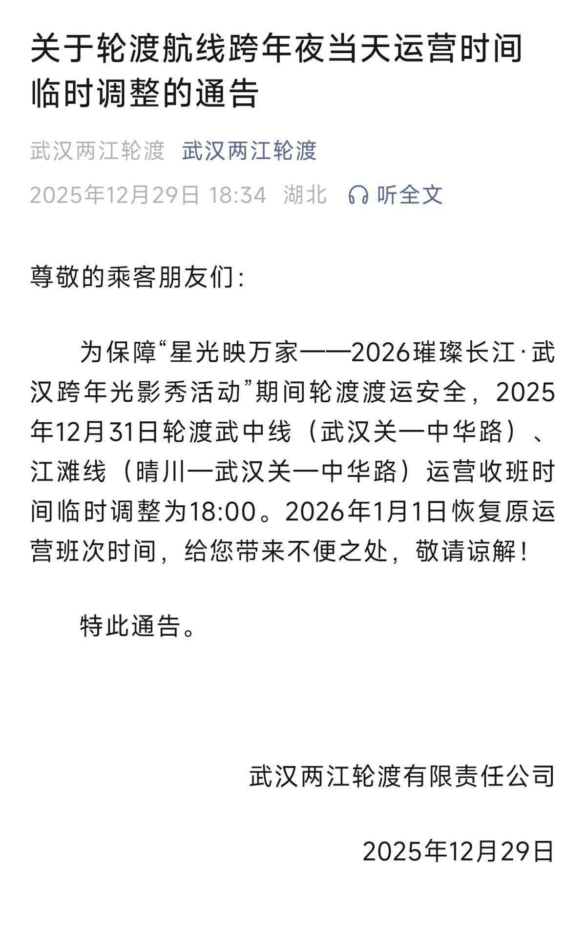 此举是为保障“星光映万家——2026璀璨长江·武汉跨年光影秀活动”期间的渡运安全,2026年1月1日起恢复原运营班次时间。