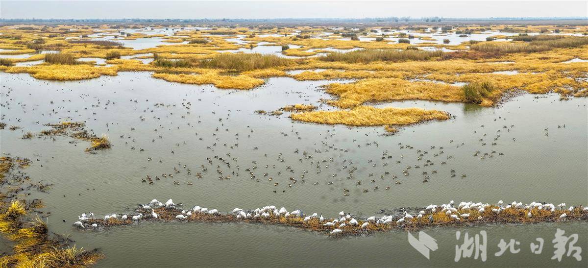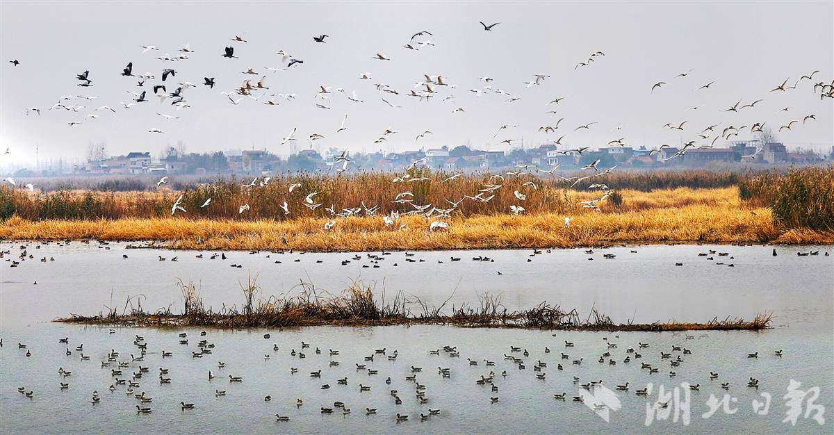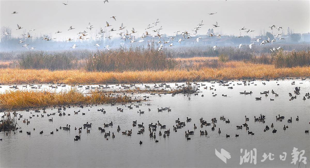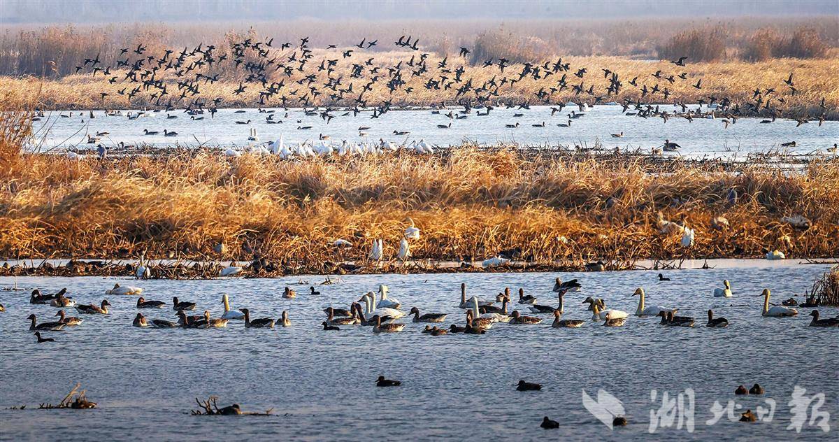 12月29日,孝感老观湖国家湿地公园白天鹅、大鹰等近十万只候鸟在此嬉戏翱翔,勾勒出人与自然和谐共生的画卷。