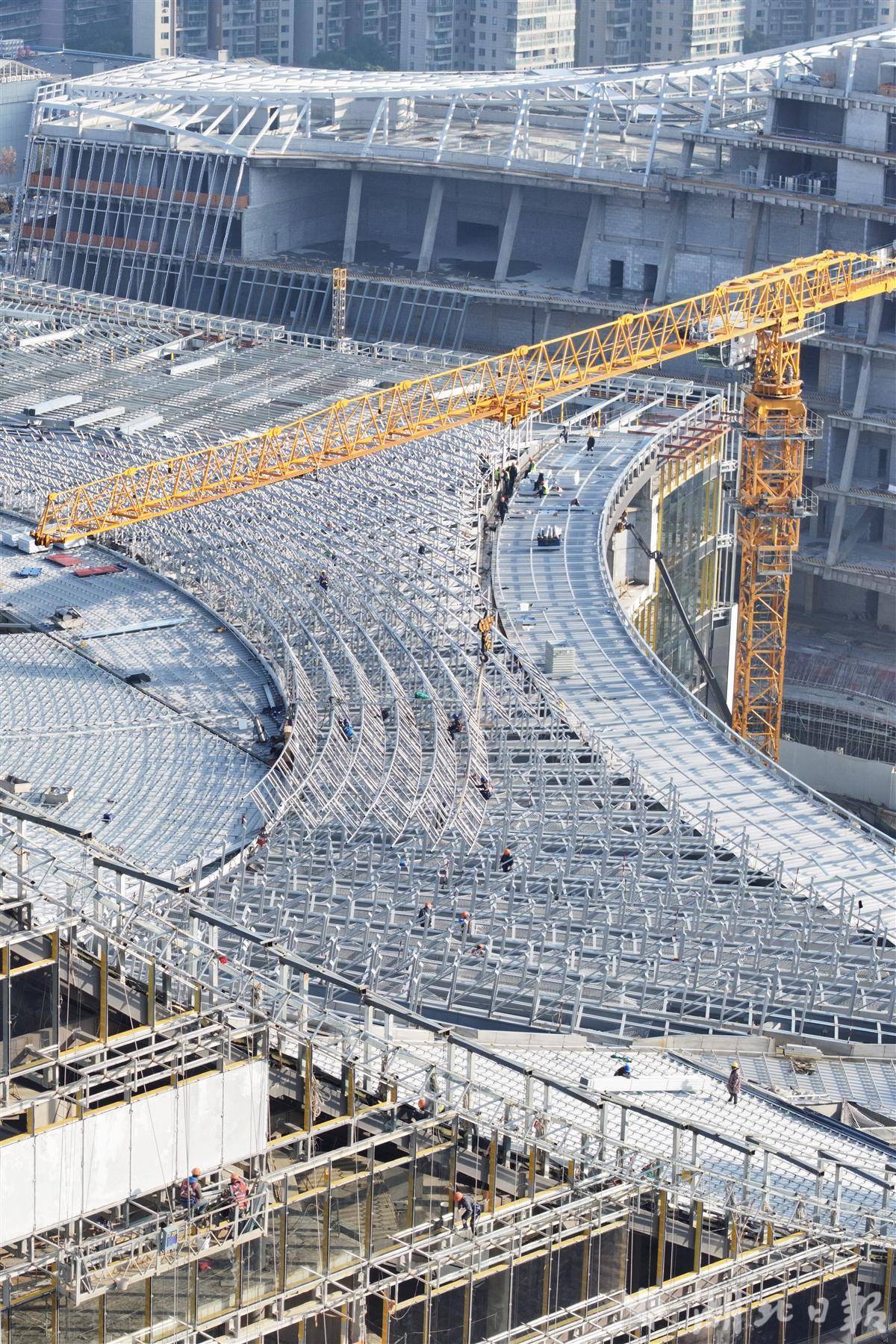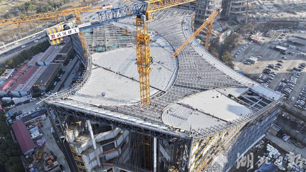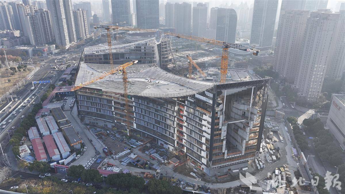 近日,位于武汉王家墩中央商务区核心地段的武汉图书馆新馆项目建设正酣。该项目总建筑面积14.23万平方米,建成后将成为武汉新的城市文化地标,更将以其庞大体量和现代设计,为市民打造一座集知识获取、文化交流、休闲体验于一体的城市文化客厅,有力提升武汉的文化软实力与城市形象。(湖北日报全媒记者 陈少哲 摄)