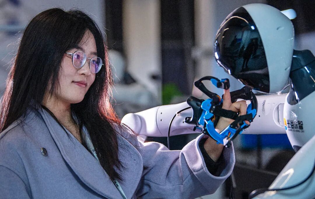 12月24日,湖北人形机器人创新中心,机器人训练师们戴上外骨骼手套正在工作。该中心有30多名机器人训练师,100余台训练机器人(朱熙勇|摄)
