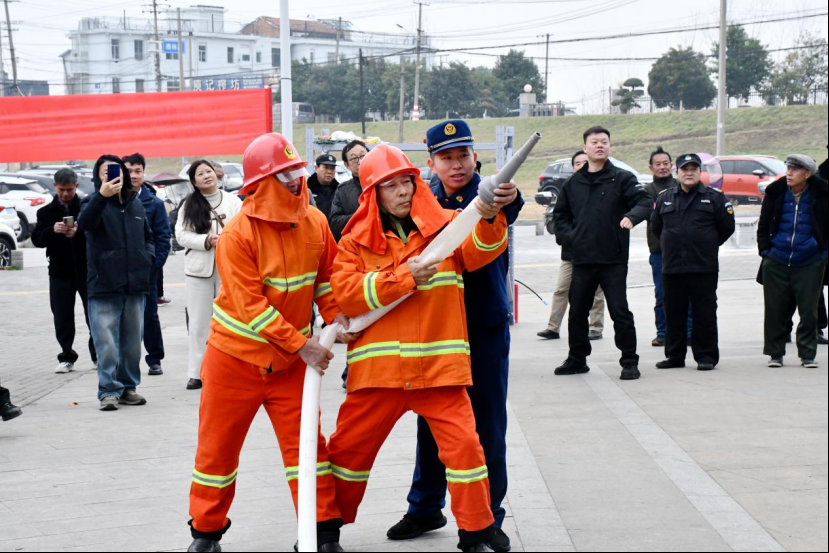 培训现场,消防宣讲员重点演示了灭火器的正确使用步骤——提、拔、握、压,以及室外消防栓水带的快速连接方法。参训物业人员认真聆听,并随后进行实操练习。