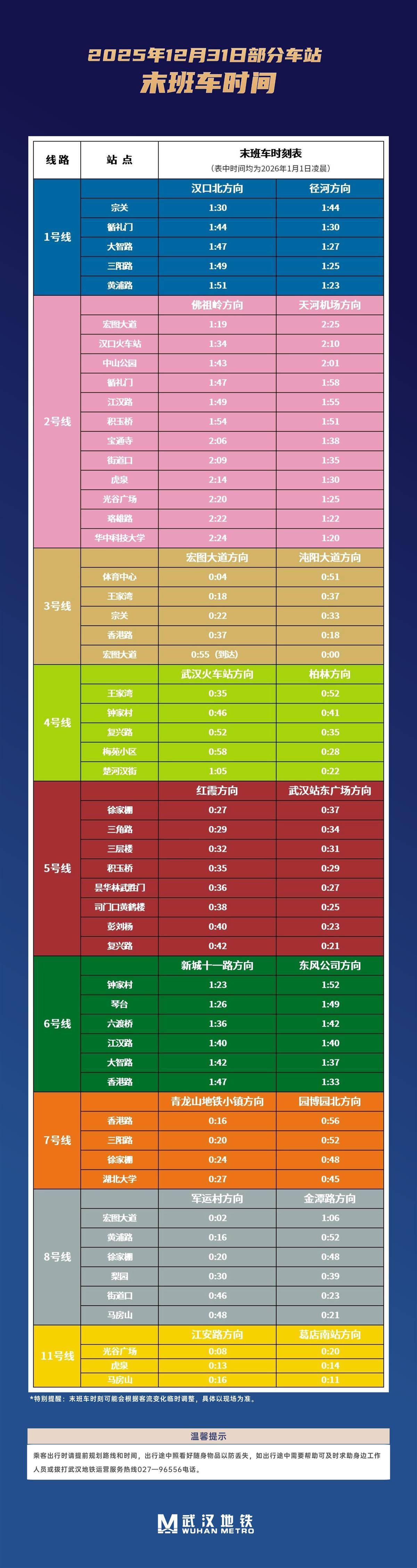 为方便市民游客规划行程,武汉地铁公布跨年夜部分车站的末班车时刻表。武汉地铁温馨提示:乘客返程时,请提前规划好出行路线和时间,注意保管好随身物品;如遇短时大客流,请配合工作人员引导,做到文明有序通行;有需要帮助,可随身联系身边工作人员或拨打地铁运营服务热线027—96556。