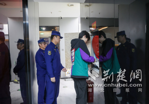 荆门市掇刀区消防救援大队开展夜间突击检查,随机抽查网吧工作人员消防设施操作能力。通讯员供图