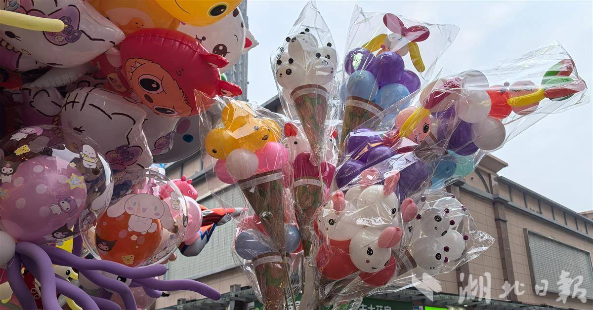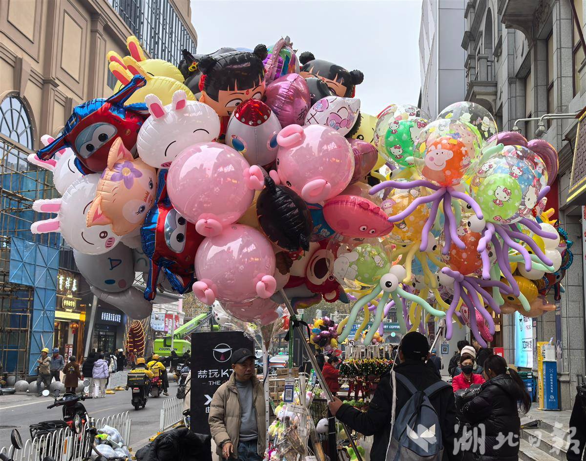 江汉路步行街上,气球摊主们早早“占据”了街角。发光波波球、星空气球、卡通造型气球等随风轻晃。