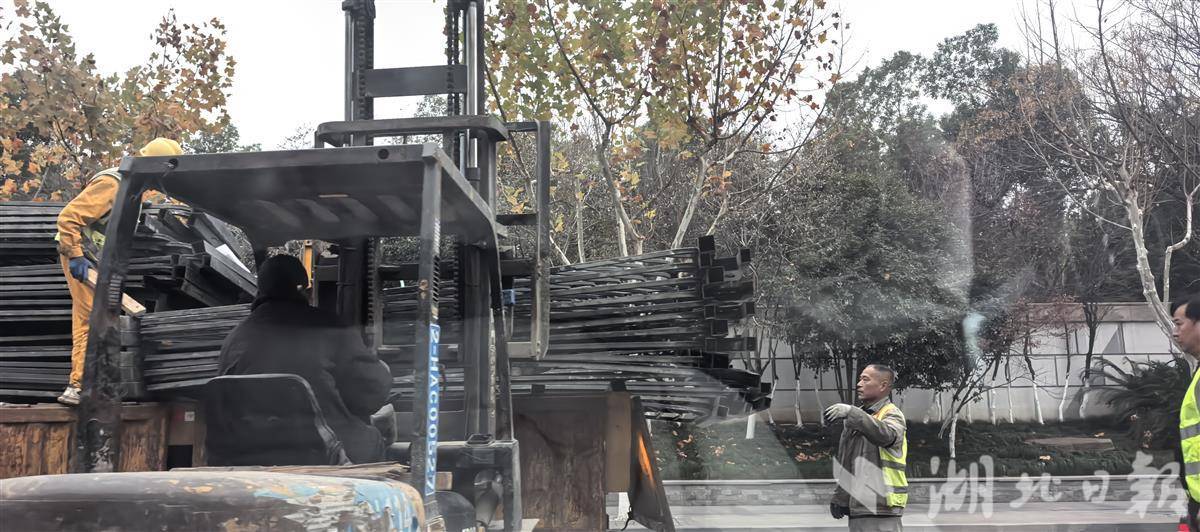 为应对人流大军,江汉关钟楼前,沿江大道路段的中间阻隔栏已被陆续拆除。明晚,这段马路将临时作为步行区域,容纳更多市民游客共迎新年。