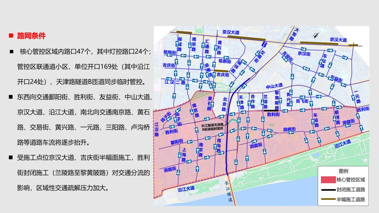 为保障核心区域群众安全,江岸交警预计将于31日17:30起启动疏导区分流,18:30对指定区域启动核心交通管控,管控范围为沿江大道(武汉关至一元路)、江汉路(不含)、中山大道(江汉路至黄石路)、黄石路(不含)、胜利街(黄石路至一元路不含)、一元路(不含)合围区域,管控期间该区域禁止机动车通行。交管部门将根据现场人流车流情况,逐步逐片恢复交通,具体恢复时间以现场交警指挥为准,请广大驾驶员自觉遵守管控规定,切勿强行闯卡。