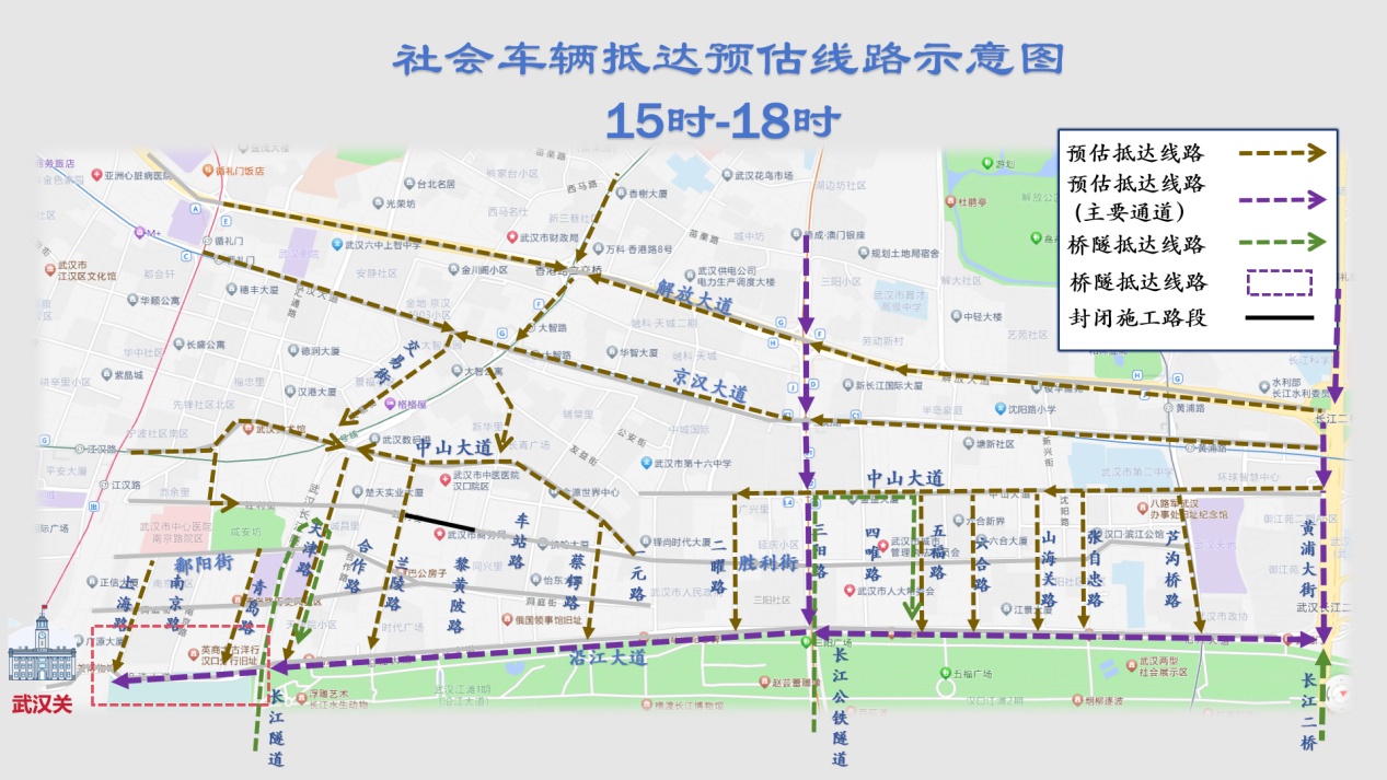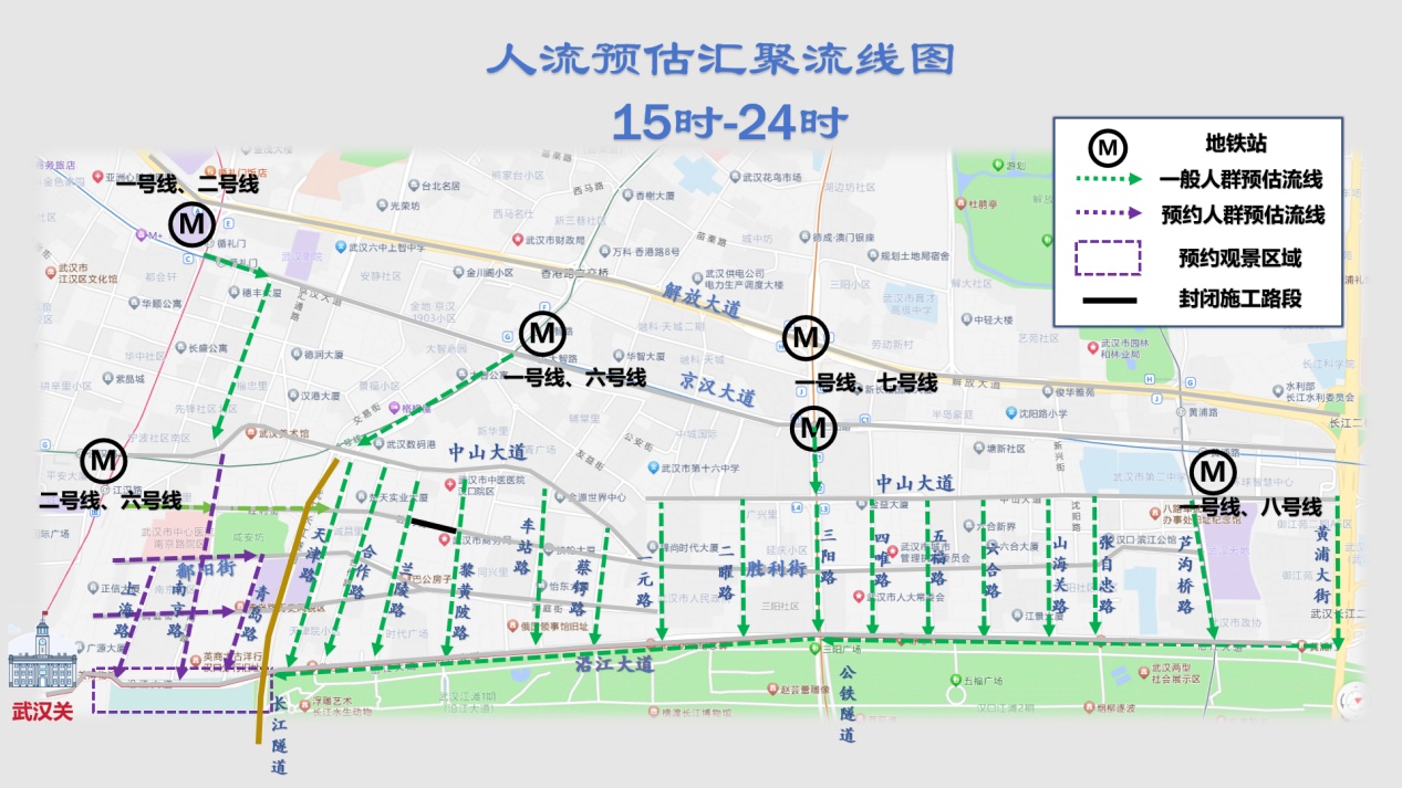 预计15:00起,江岸辖区“两隧一桥”、京汉大道、沿江大道、三阳路、黄浦大街、中山大道等主干道,以及卢沟桥路、三阳路、大智路、江汉路等地铁公交枢纽,将迎来人流车流多点向历史风貌区、城市阳台区域“向心汇聚”,建议市民尽量避开通过上述路段前往核心区域。