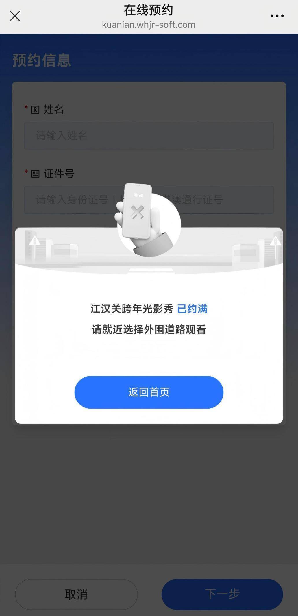 12月31日,记者扫描“你好,2026江汉关跨年光影秀”官方预约码时,页面弹出提示:“光影秀已约满”。