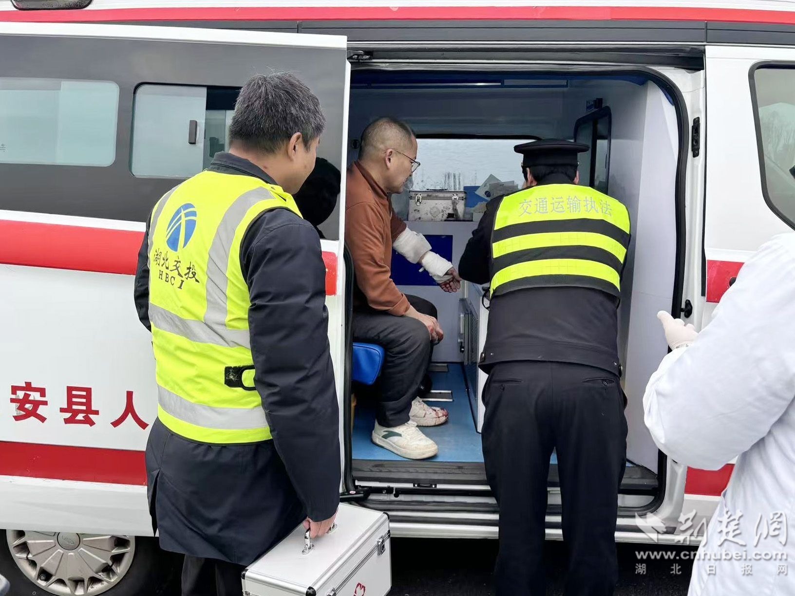 14时58分,救护车抵达现场。路政执法人员小心搀扶伤者,避开路面碎片稳步护送上车,并向医护人员详细交代伤情:“伤员左前臂有3厘米伤口,已消毒包扎,意识清醒,生命体征平稳。”完成交接后,救护车迅速驶往医院。