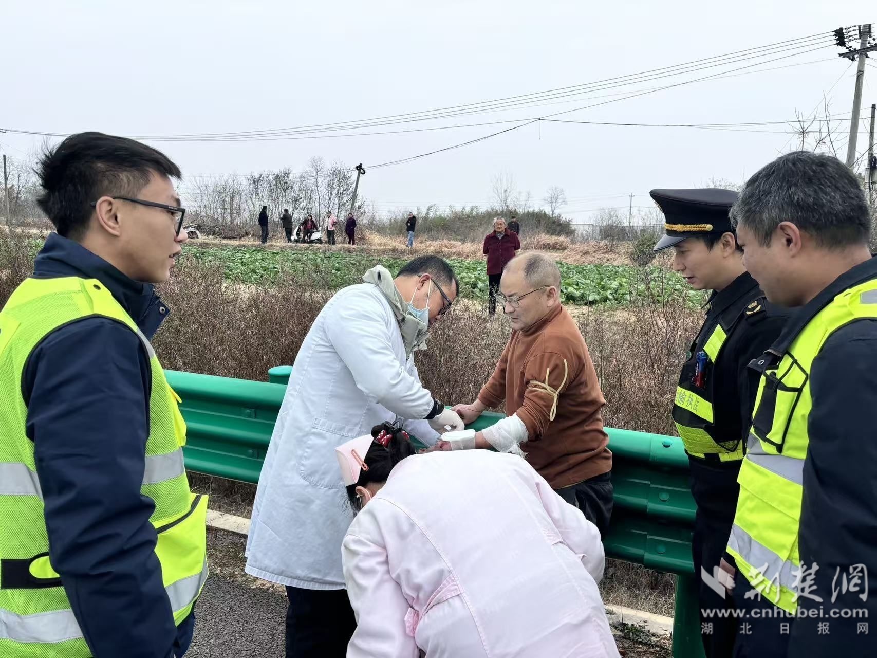 消毒、覆盖敷料、包扎固定……不到五分钟,伤口已得到妥善处理。“别担心,救护车马上就到。”路政执法人员一边包扎,一边持续安抚司乘人员。