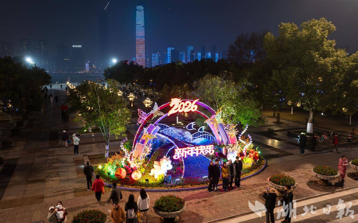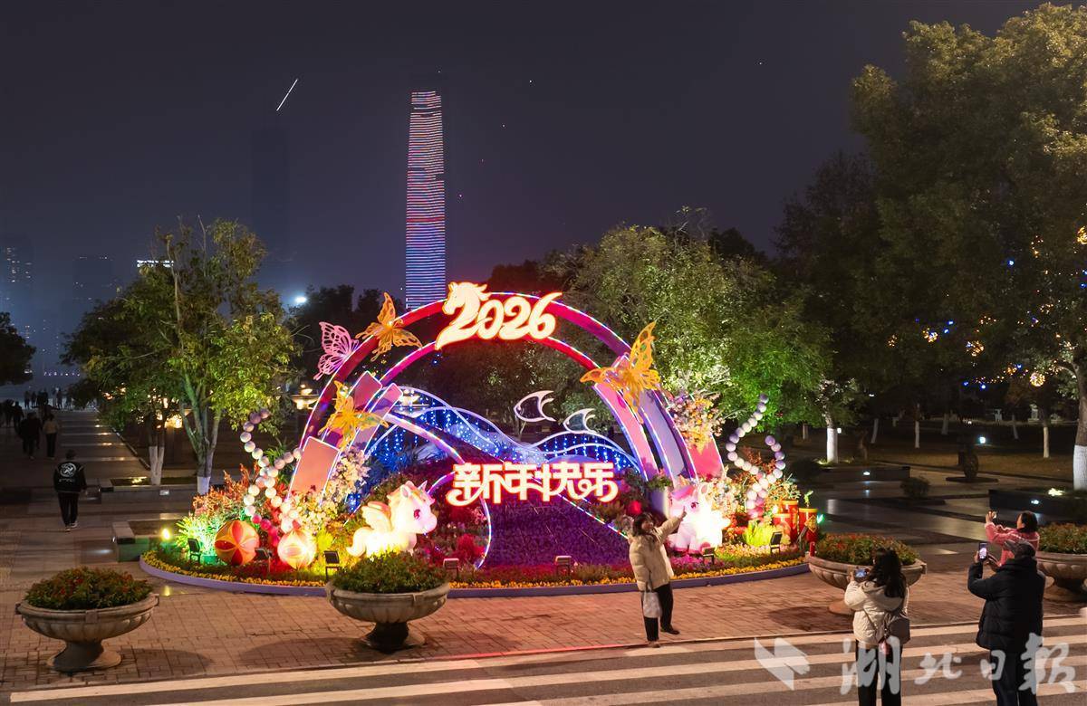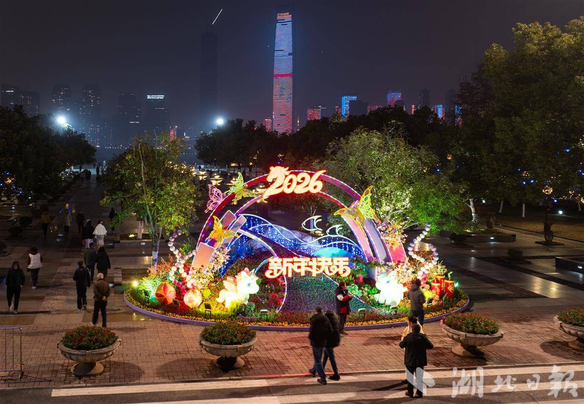12月30日,武汉汉口江滩三阳广场,马年主题灯彩璀璨点亮,流光溢彩氛围感拉满,吸引众多市民游客打卡拍照、提前感受新年氛围。(湖北日报全媒记者 薛婷 摄)