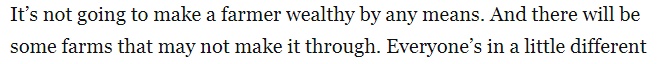 爱荷华州大豆协会主席汤姆·亚当(Tom Adam)在文章中表示,政府的农业救助计划“可能还不够。无论如何,这些救助都无法让农民变得富有,而且有些农场可能撑不过去。我听很多人说这可能是他们最后一年了:不管是破产还是想尝试其他出路。”