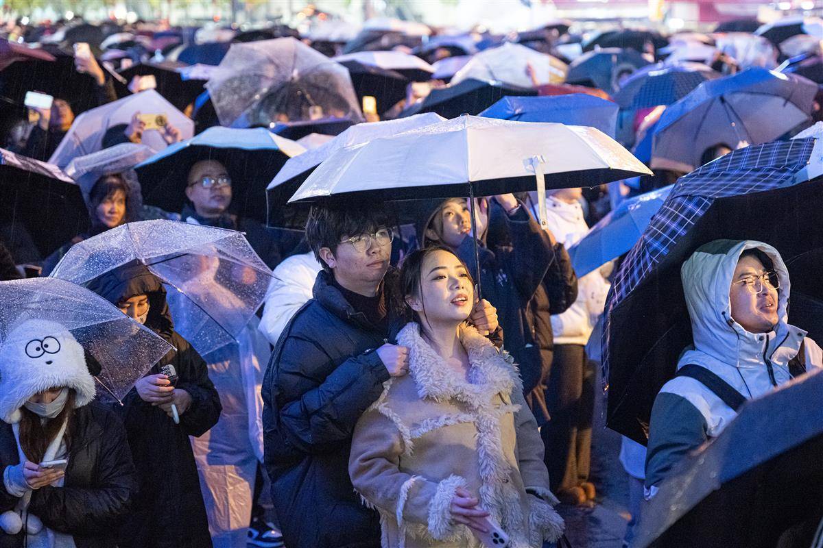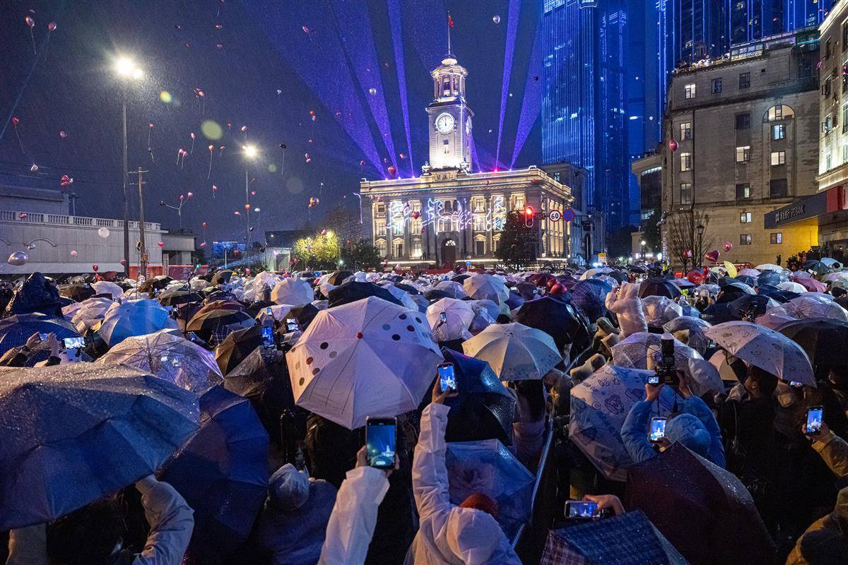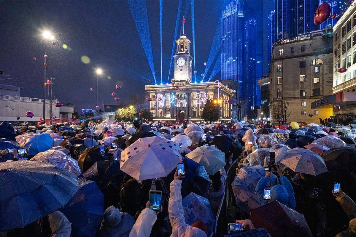 2026年1月1日凌晨,武汉江汉关大楼前人潮涌动,数万人一同欣赏着炫彩夺目的跨年光影秀并齐声倒数,一起放飞气球,告别2025,迎接2026。(湖北日报全媒记者 任勇 摄)