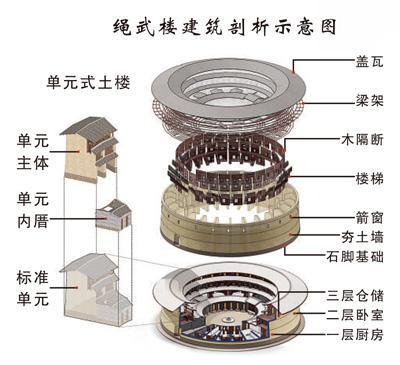 土楼有着严谨的营建工序,大致有选址定位、基础砌筑、夯筑土墙、竖柱献架、出水盖瓦、内外装修等步骤。