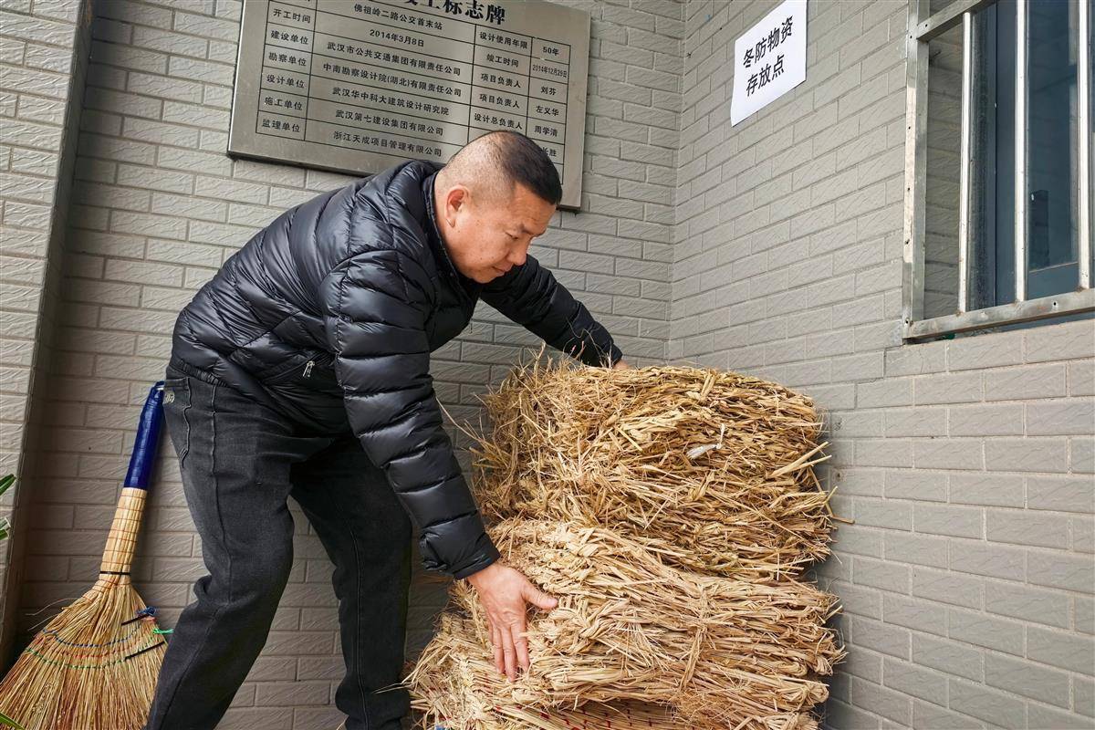 在武汉公交佛祖岭三路高新六路场站,铁锹、草垫、融雪剂等应急物资整齐堆放,随时待用。该场站安全员陈伟表示,为应对寒潮冰冻天气,每个公交场站均储备了充足的铁锹、草垫、三角木及融雪剂,并组建了应急突击队。“一旦出现极端天气,应急队伍30分钟内即可集结,对场站、车门踏板等重点部位除雪除冰。”陈伟回忆,去年寒潮时草垫有效帮助乘客防滑,今年储备更充分,只为突发情况时快速响应,全力守护市民寒潮天气里出行安全。