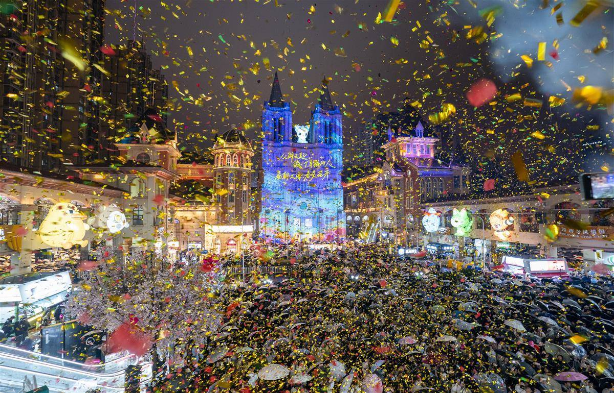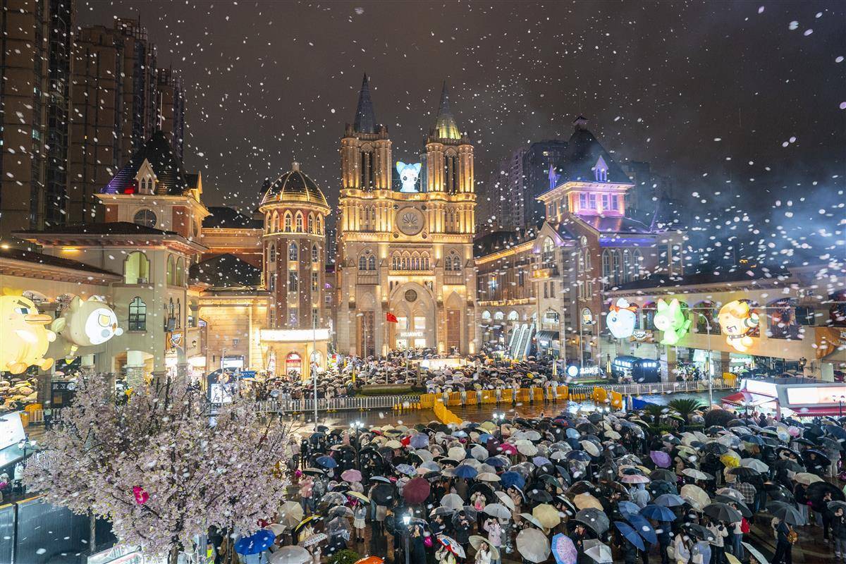 2025年12月31日晚至2026年1月1日凌晨,光谷步行街上,大学生和市民手持雨伞从四面八方汇聚到一起,共同等待新年的到来。漫天飞舞的人造雪和金色彩纸点燃了新年倒计时的节日气氛。(湖北日报全媒记者 魏铼 摄)