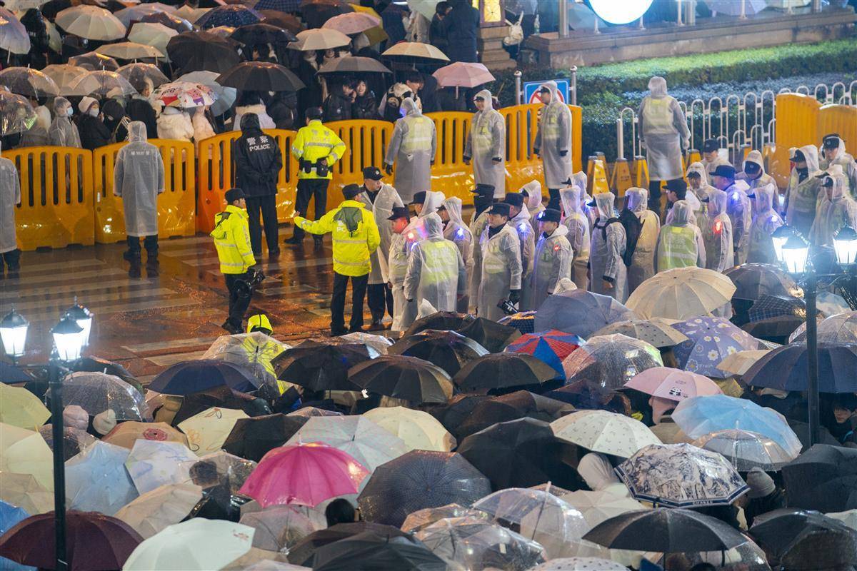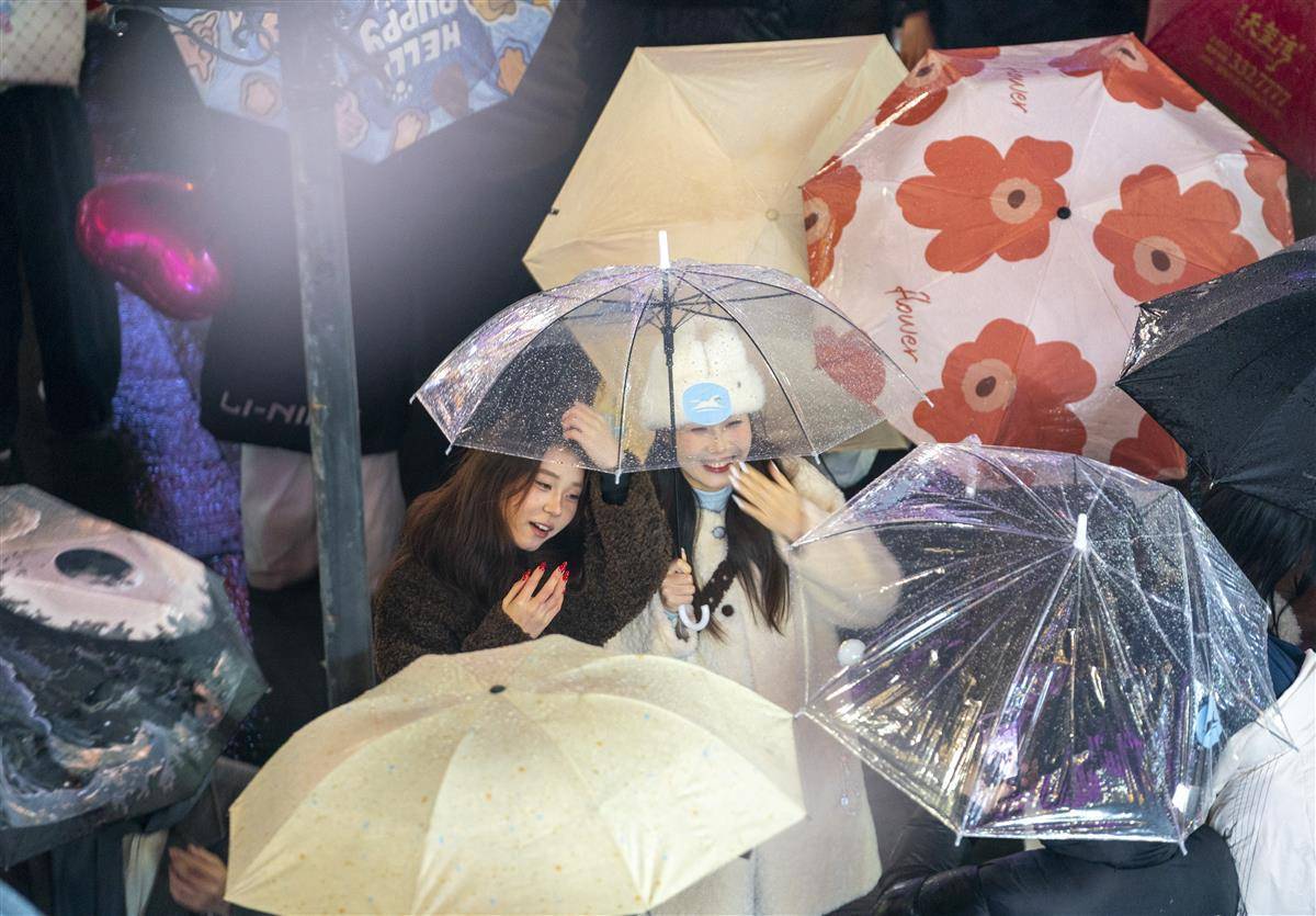 2025年12月31日晚至2026年1月1日凌晨,光谷步行街上,大学生和市民手持雨伞从四面八方汇聚到一起,共同等待新年的到来。