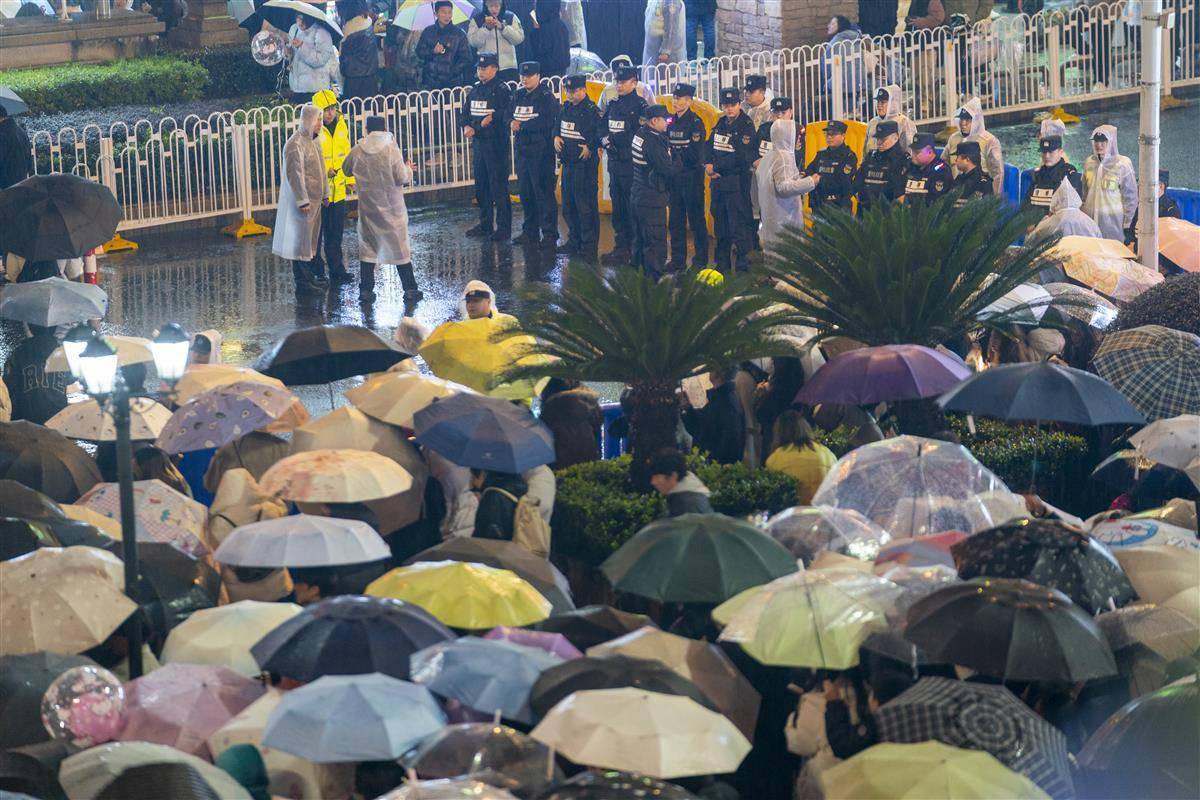新年的雨中,执勤的民警辅警坚守岗位。