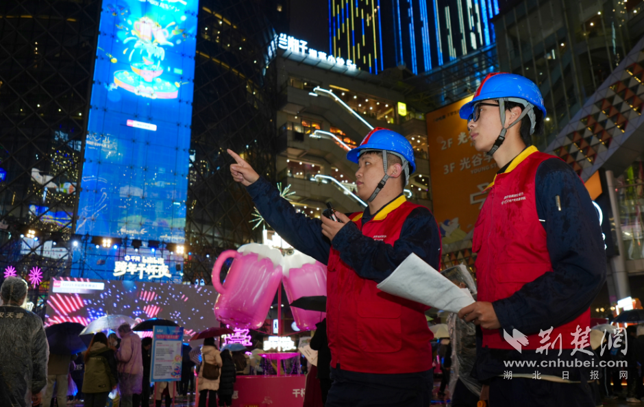 国网武汉供电公司介绍,在跨年夜到来前,该公司就对13处光影秀点位及人流聚集区域制定专项保电方案,覆盖13个重点保电点位、22条配电线路及11座变电站,确保各项保电任务落细落实。