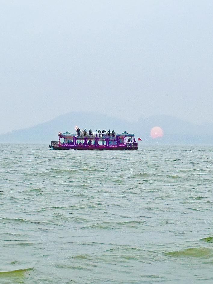 就在此时,有游客望向窗外忽然惊呼:“看,远处好像有朝阳!”当游船行至凌波门码头附近时,对岸磨山方向竟浮现出一轮朦胧的红色光晕。