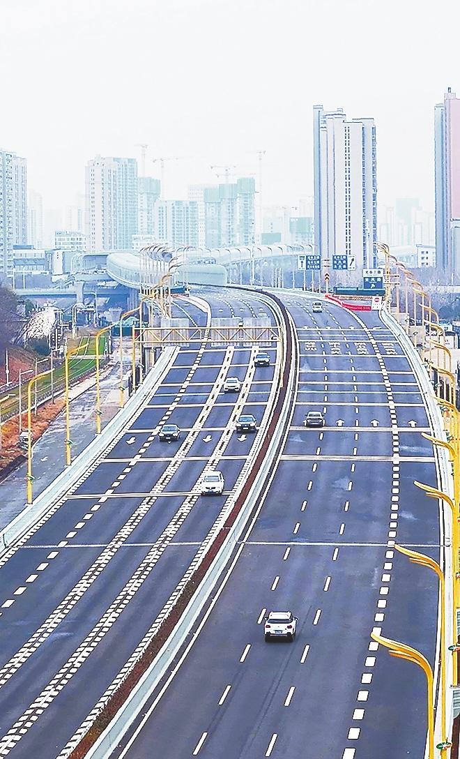 1月1日,新年第一天,武汉光谷高新三路(三环线—外环线)高架通车。市民驾车从三环线武黄立交出发到新武东收费站,通行时间由原来的近25分钟缩短至最快7分钟。高新三路高架开通后,将串联起武汉市主城区、东湖高新区、鄂州市,打通“武鄂黄黄”一体化交通主动脉。(湖北日报全媒记者 魏铼 摄)
