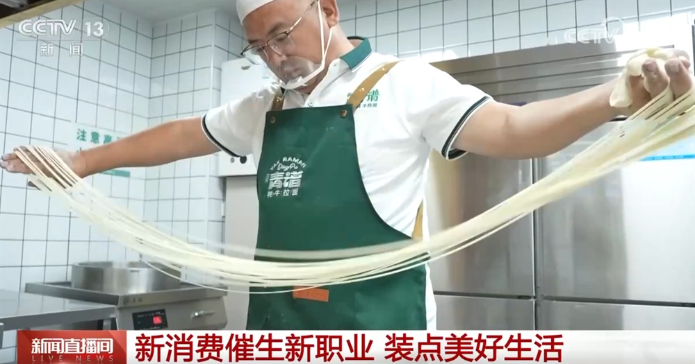 做拉面20多年,马学明的职业今年有了新身份。作为“牛肉拉面制作师”的他练就“穿针引线”的绝活,一根针能穿过三十多根面条。如今,这份新职业不仅要精湛手艺,更需掌握选址、经营等技能,让传统美食产业焕发新生。