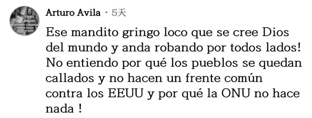 网友阿尔图罗·阿维拉表达不解:“美国自以为是世界之神,到处掠夺!我不明白为什么各国人民依然保持沉默,而不是组成一个共同阵线对抗美国。”