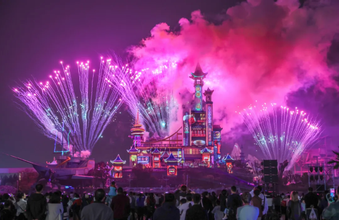游客在襄阳市华侨城奇幻度假区观看奇梦城堡光影秀(徐敏|摄)