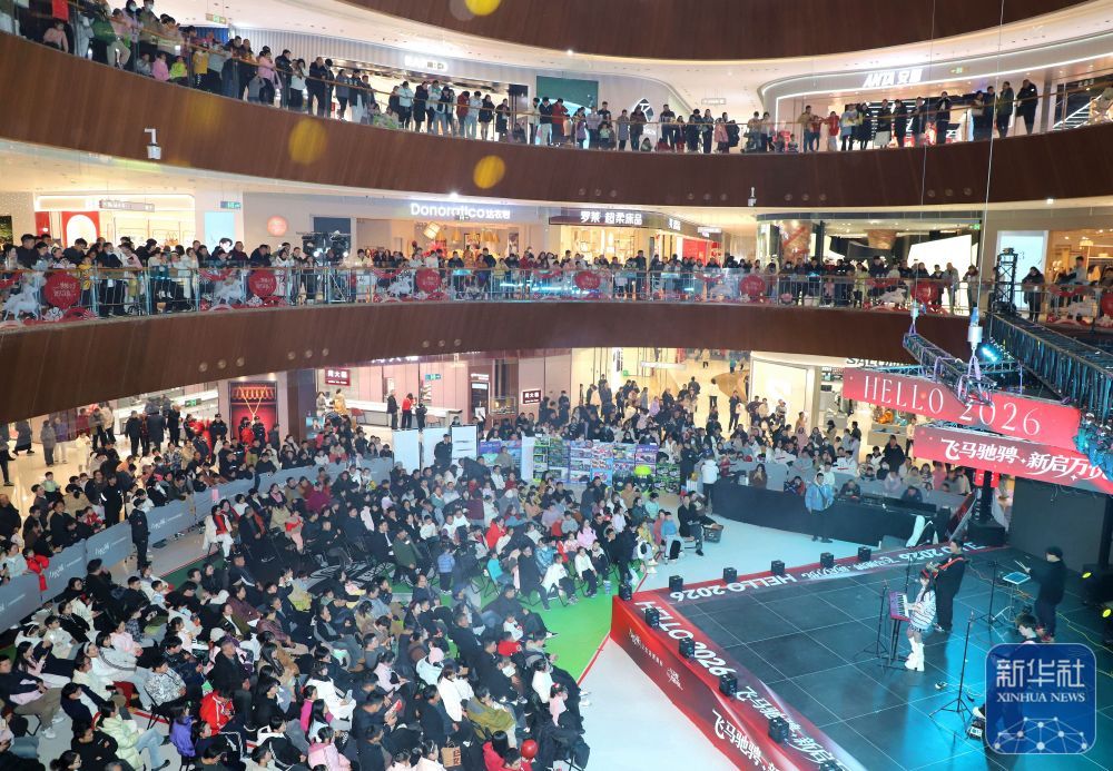 ↑ 1月1日,人们在河南省南阳市一家商业城内观看迎新年演出。新华社发(高嵩摄)