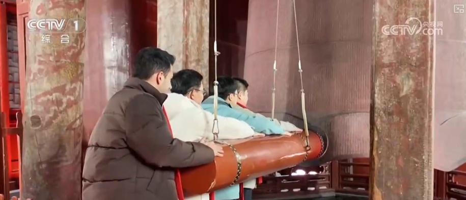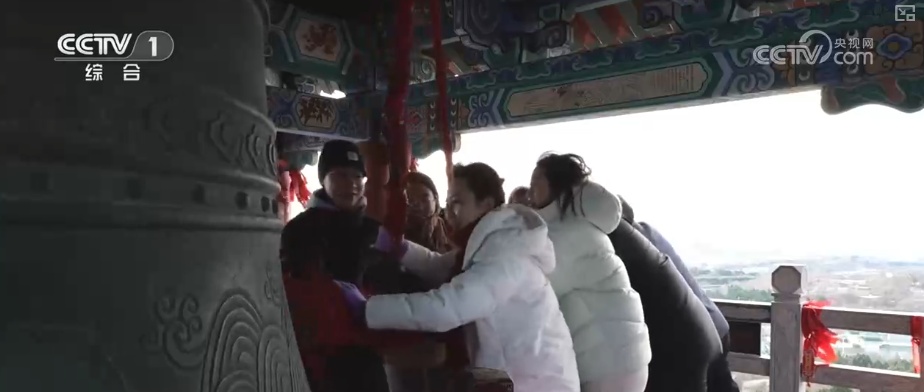 鼓声暂歇,市民们用力地摆起钟锤,重重地撞向铜钟。悠扬的钟声在空中久久回荡,大家载歌载舞,共同欢庆2026年的到来。