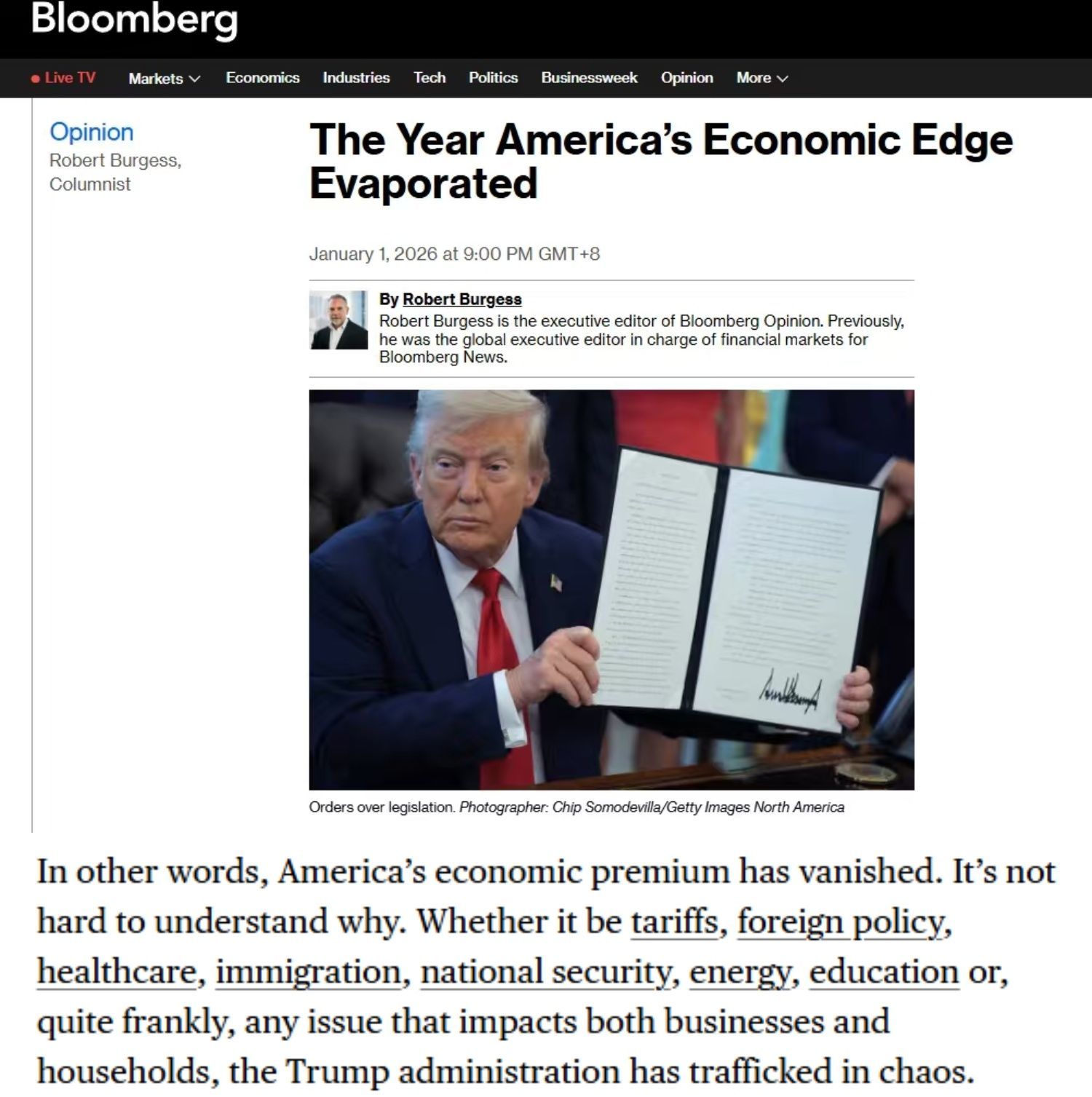 彭博社近日刊文称,美国经济优势已消失殆尽。文章分析认为这一现象的产生并不难理解。无论是在关税政策、外交事务、医疗体系、移民问题、国家安全、能源战略、教育等诸多领域,抑或是任何切实影响企业与民众生活的议题,美国政府的执政轨迹始终与混乱相伴。