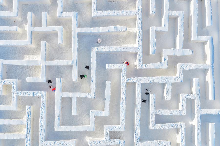 An aerial drone photo taken on Jan. 2, 2026 shows visitors exploring a giant maze made of ice and snow in Tongjiang, northeast China's Heilongjiang Province. (Photo by Liu Wanping/Xinhua)