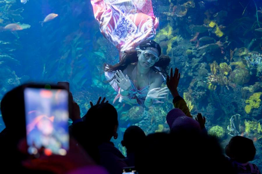 A performer dressed in a mermaid costume greets visitors at an ocean park in east China's Shanghai on Jan. 1, 2026. (Xinhua/Wang Xiang)■