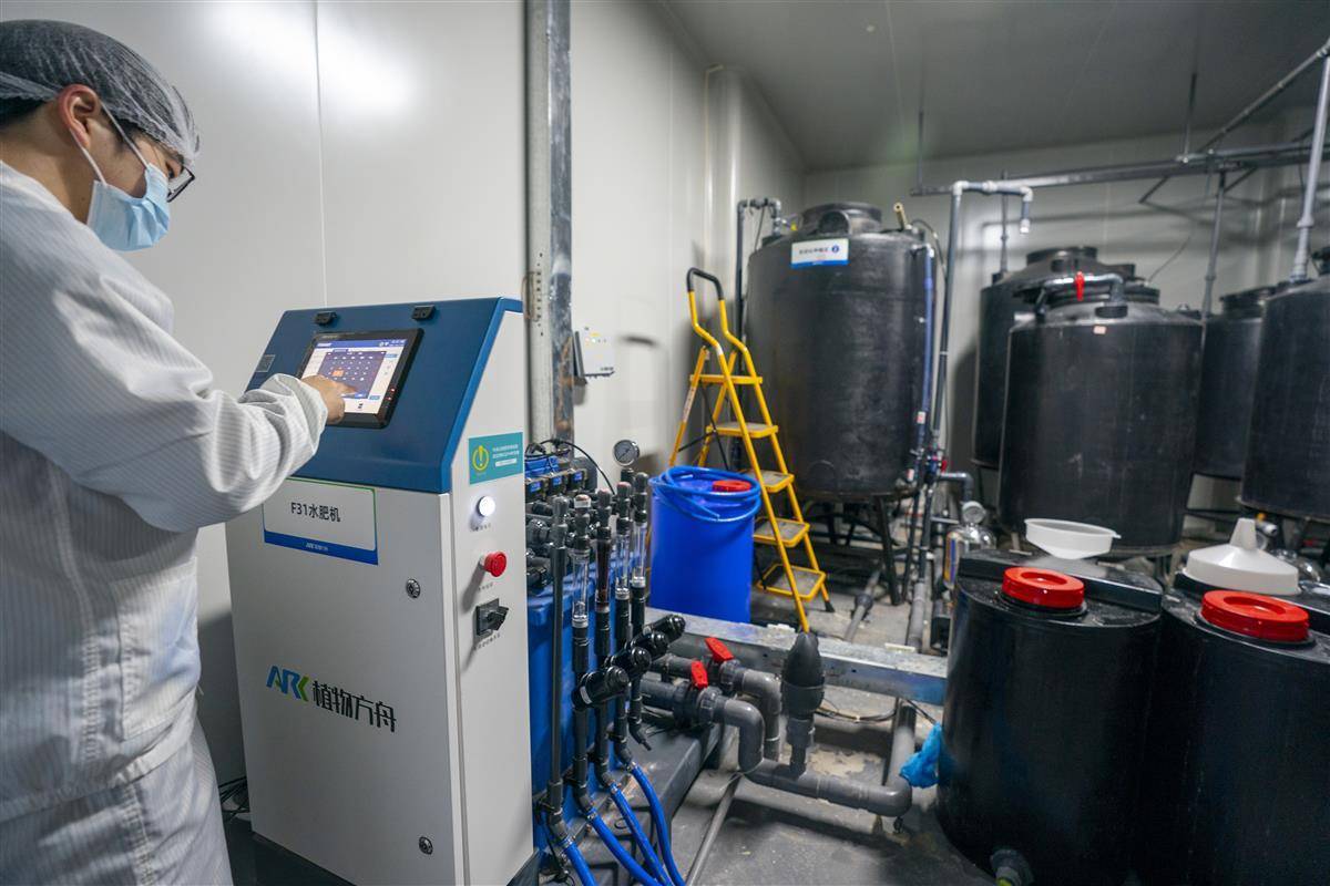 植物方舟草莓基地,技术人员在检查调整自动水肥系统。