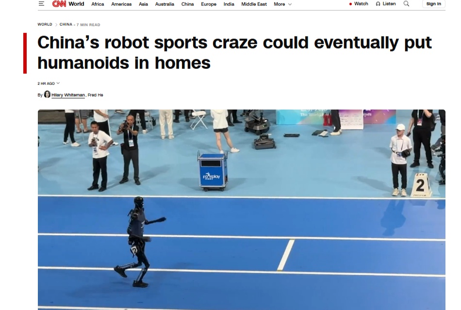 文章说,2015年以来,中国机器人产业加速发展。根据中国国内的权威数据,目前中国已拥有150多家人形机器人公司,且数量持续增长。对于许多机器人企业来说,体育已成为一个展示产品能力和探索应用途径的试验场。正是在这样的背景下,2025 年中国机器人体育赛事激增:人形机器人不仅登上春晚舞台,完成了半程马拉松比赛,北京还举办了世界上首届人形机器人运动会 ,在多项体育项目中考验了机器人的能力。文章指出,以足球等为代表的体育项目一直被科学家认为是测试机器人的标准项目。机器人足球需要许多“基本能力”,包括运动、视觉、定位、协作战略规划和对抗推理。