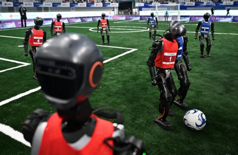 2025年8 月,在北京举办的首届人形机器人运动会上,机器人“选手”们正参与“五人制”足球比赛。 (图源:路透社)
